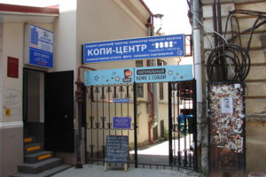 вход со двора, ажурные железные ворота с вывеской "КОПИ-ЦЕНТР" РИНХ